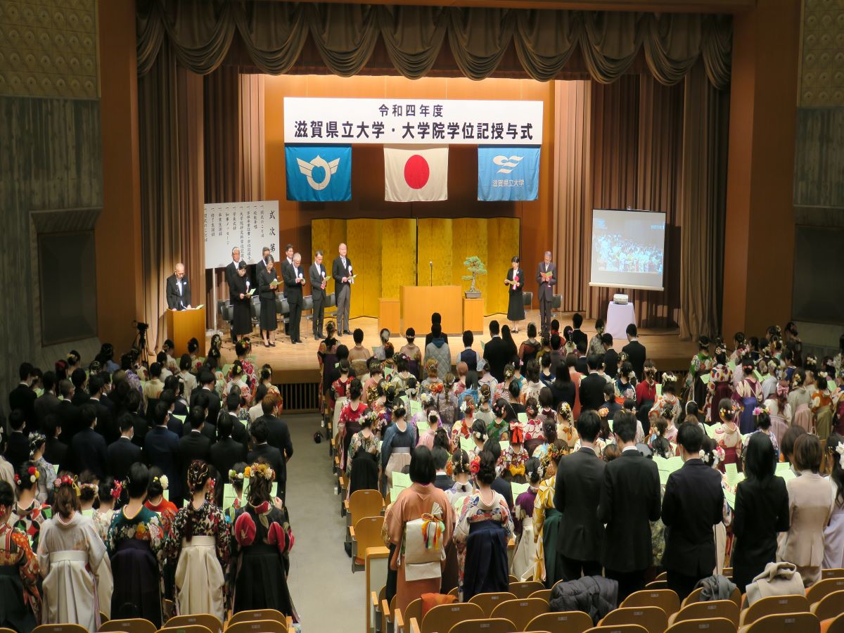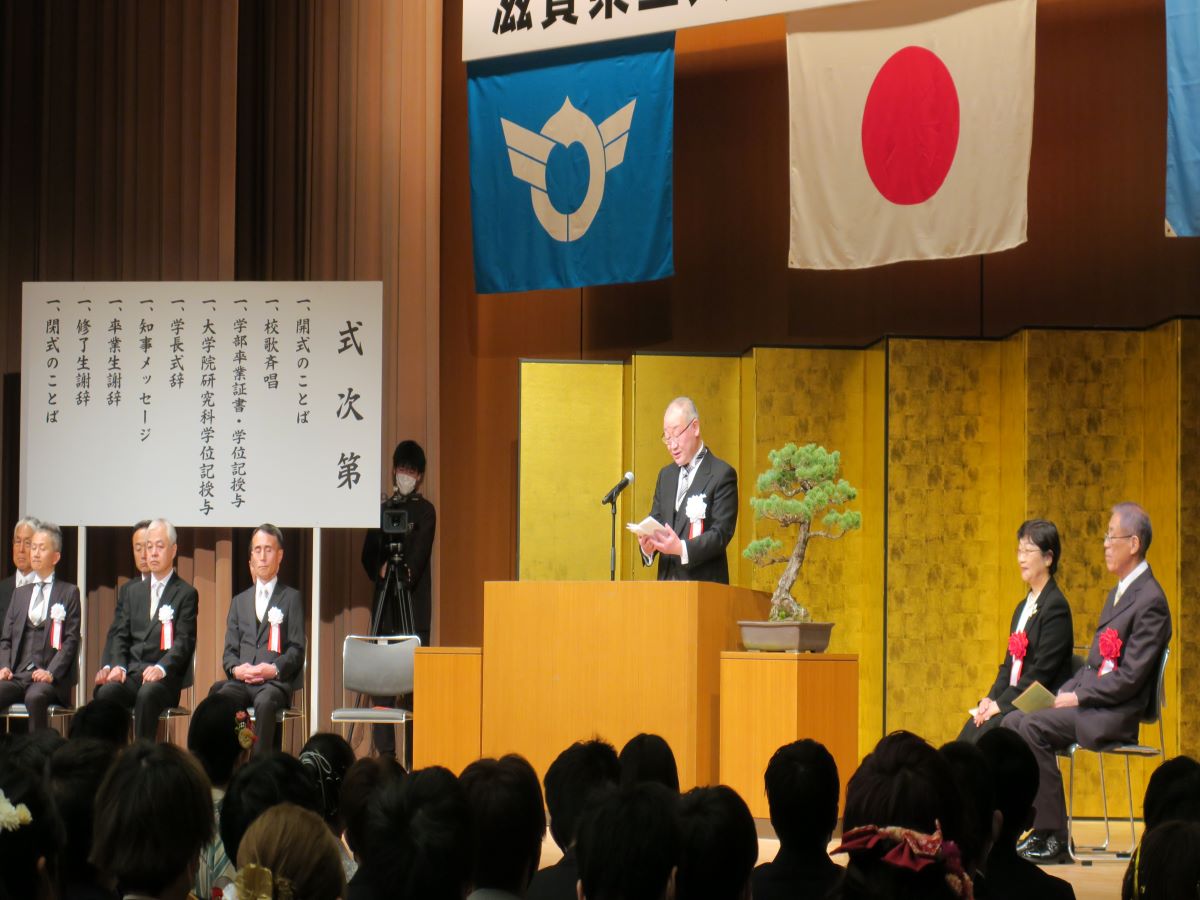 令和6年3月20日(祝)ひこね市文化プラザ グランドホールに於いて令和5年度大学・大学院の学位記授与式が行われ、湖風会会長の中川富美江氏が出席しました。