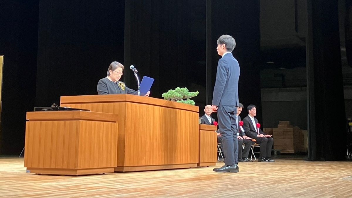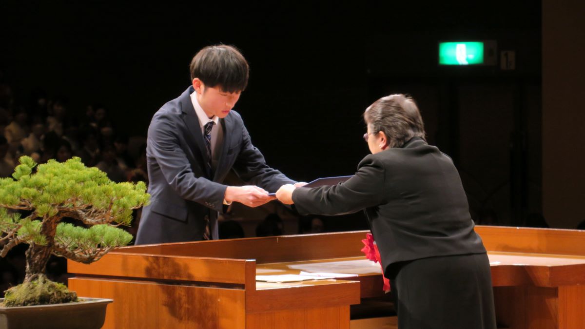 授与式の後、中川会長から、学識及び幅広い教養を身に付けたことによって選ばれた卒業生の代表に、「湖風会」学生表彰が手渡されました。